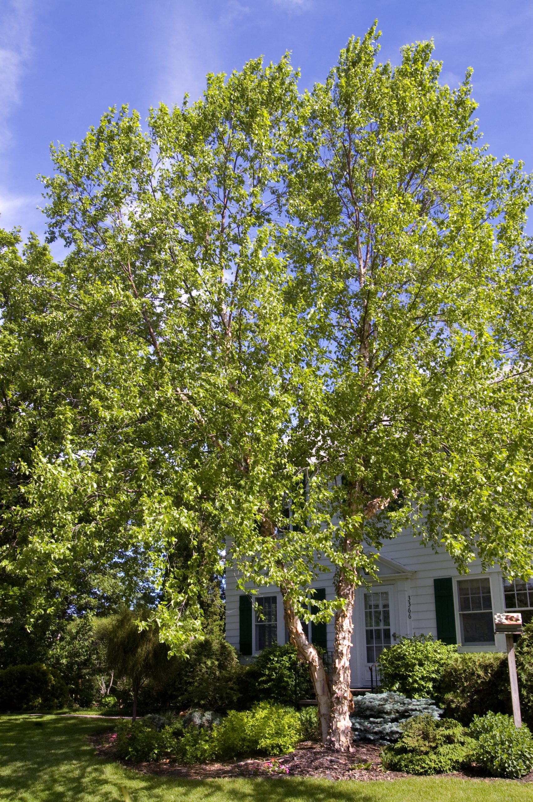 This vigorous grower has exfoliating bark that is lighter than river birch, ranging from tan to creamy white to parchment white. While it tolerates wet, poorly drained soils, it does well in upland soils, and is resistant to bronze birch borer. Clumps have three or more stems. Voted 2002 Urban Tree of the Year by the Society of Municipal Arborists.