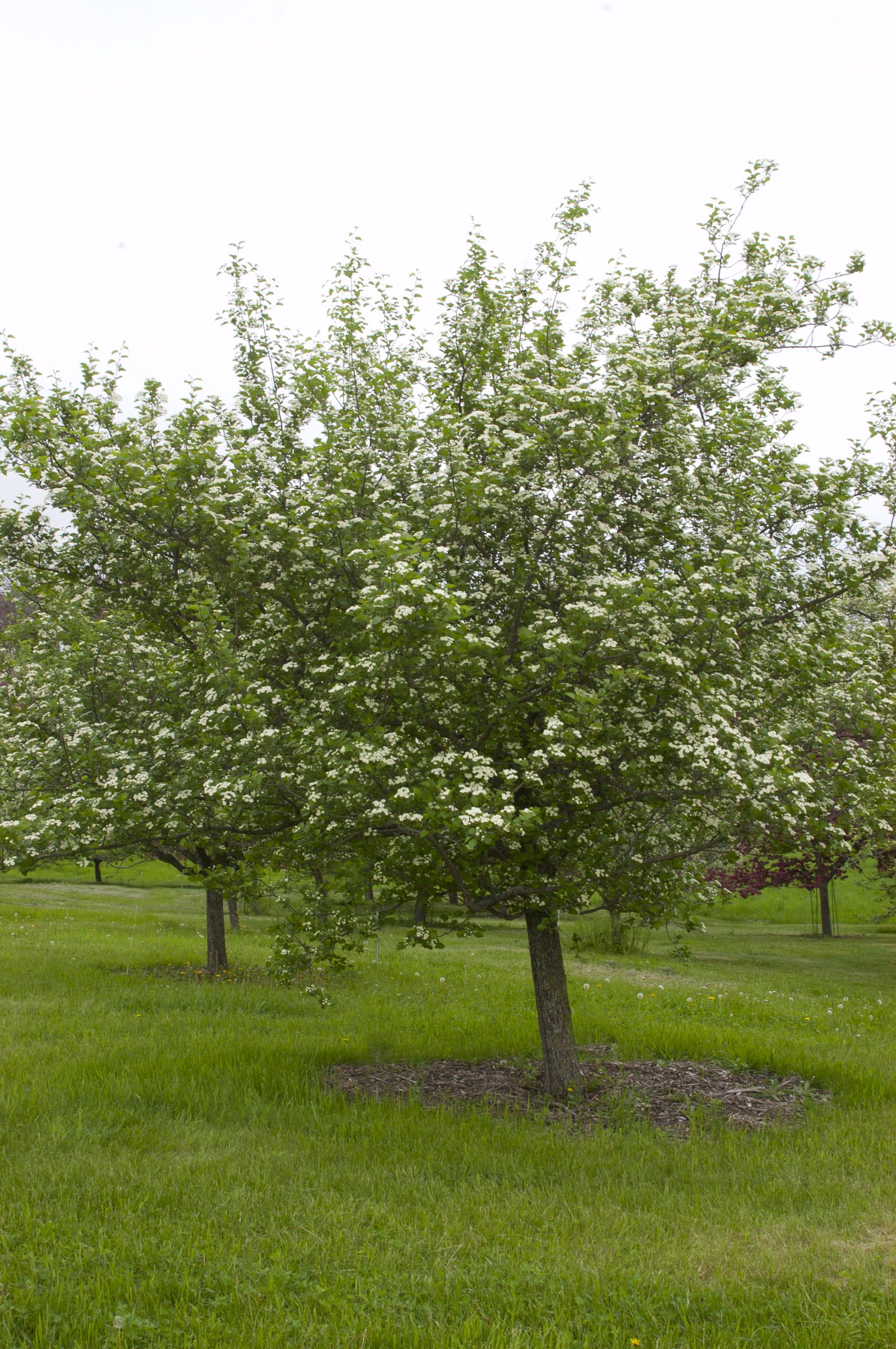 Introduced in 1967 by Morden Research Station of Manitoba, Canada, this tree originated as an open-pollinated seedling of ‘Toba’, but has shown greater hardiness. It has attractive, fragrant double white flowers, but fruit production is sparse. A COPF introduction.