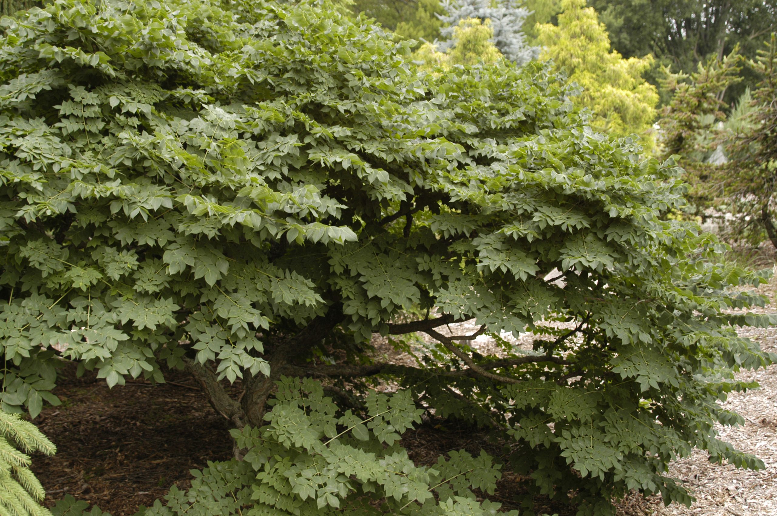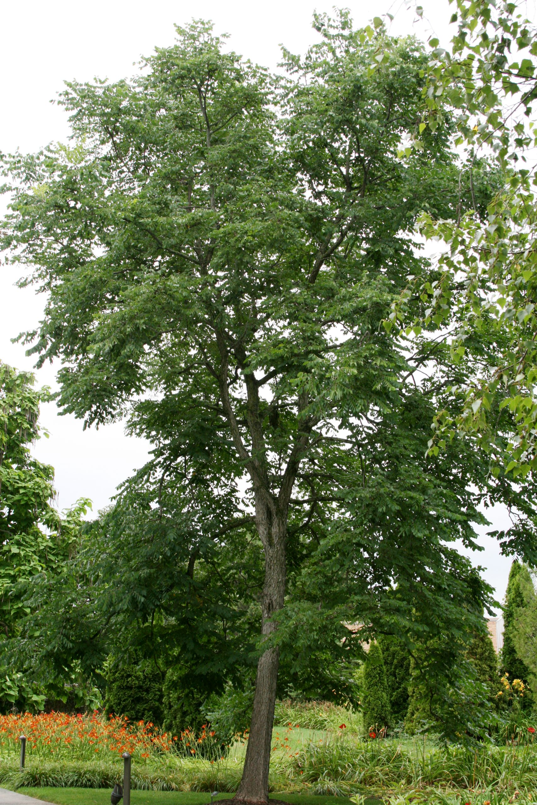 This picturesque tree has deeply furrowed bark and stout branches that are particularly handsome in winter. It prefers deep, moist soil and full sun, but is adaptable to many conditions such as alkaline soil, salt, and drought. The mahogany seed pods are long and leathery.